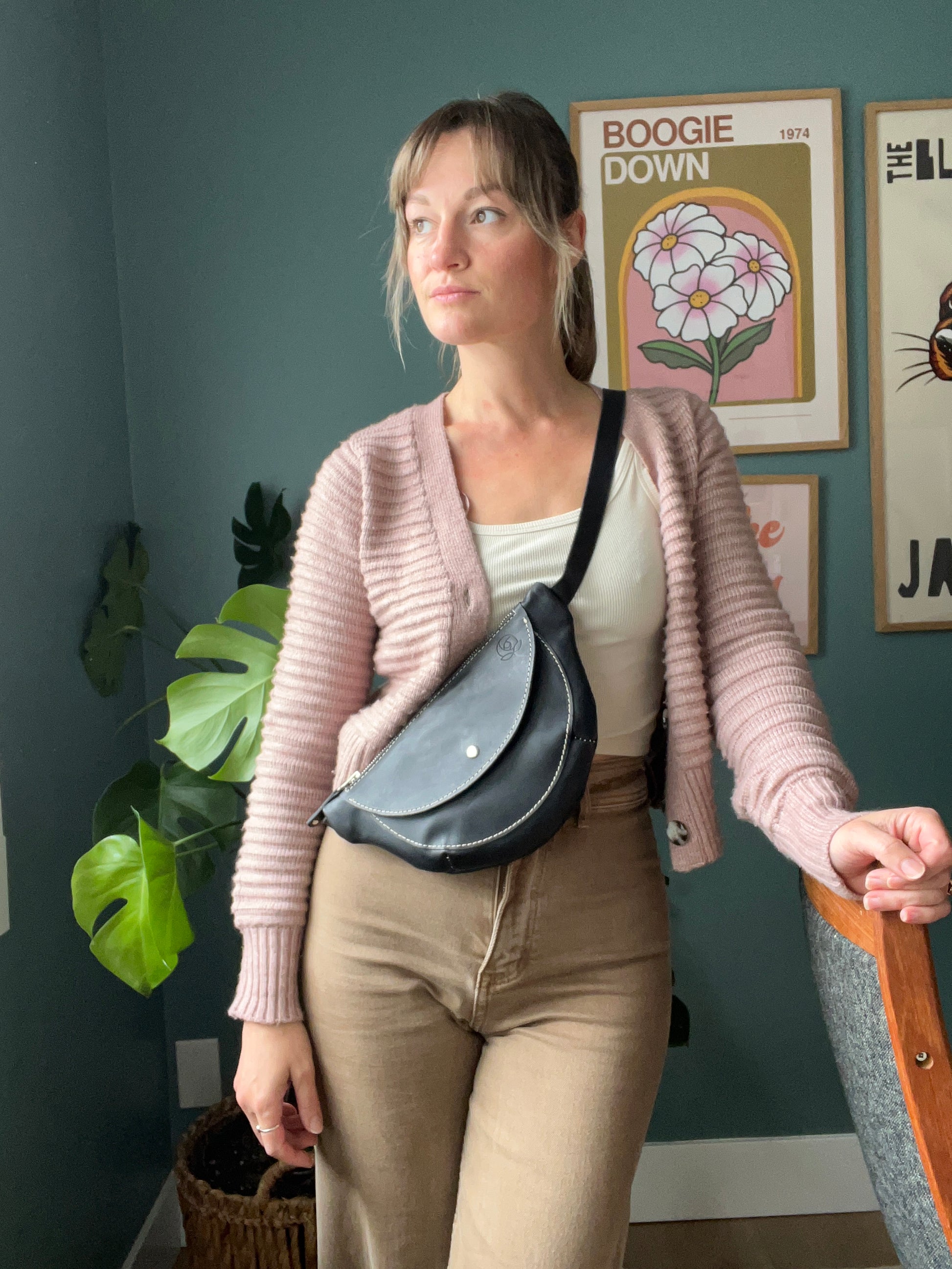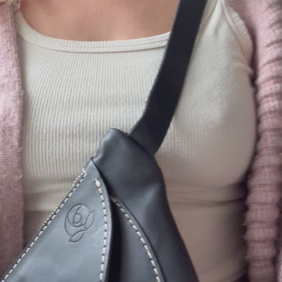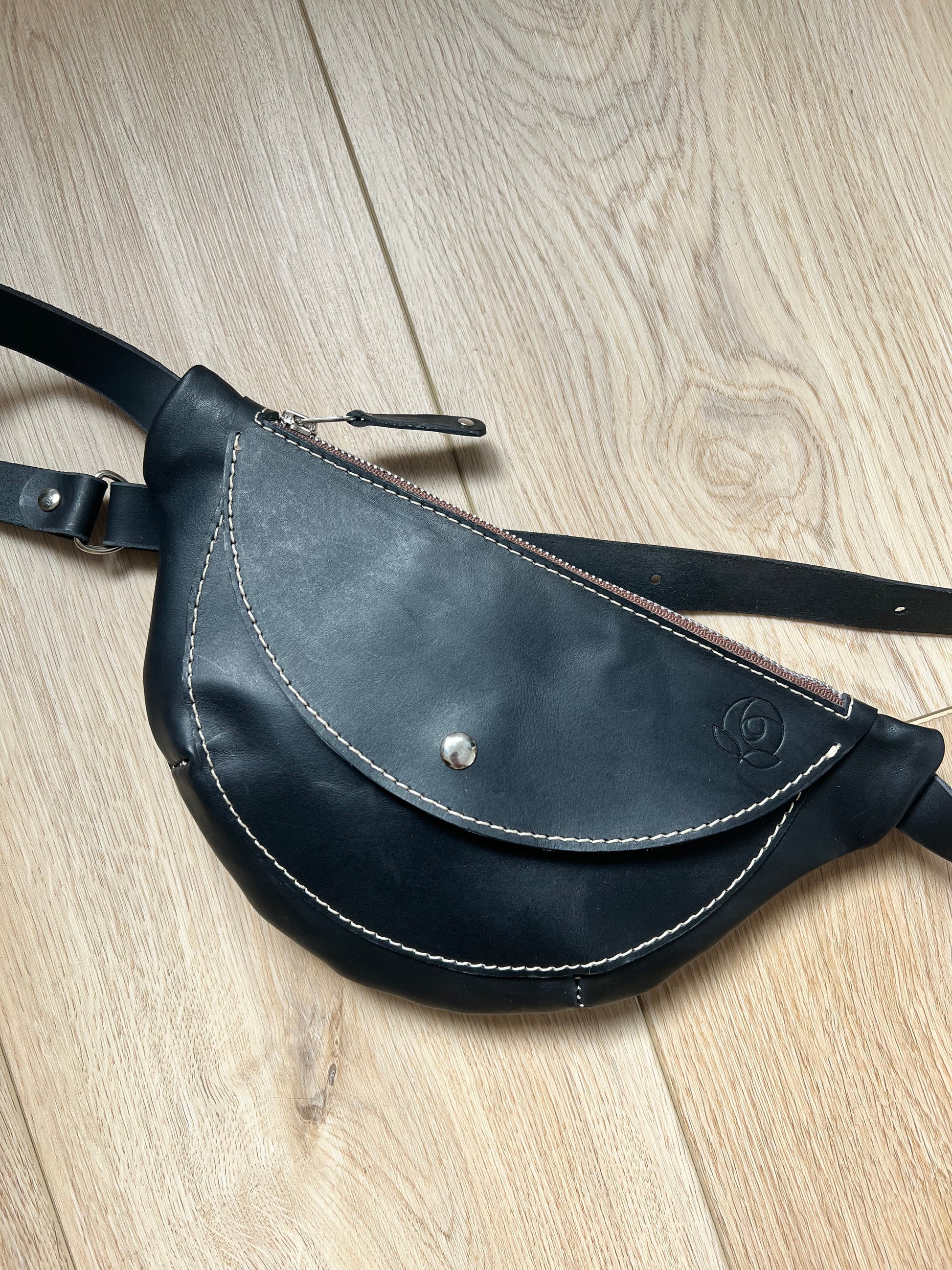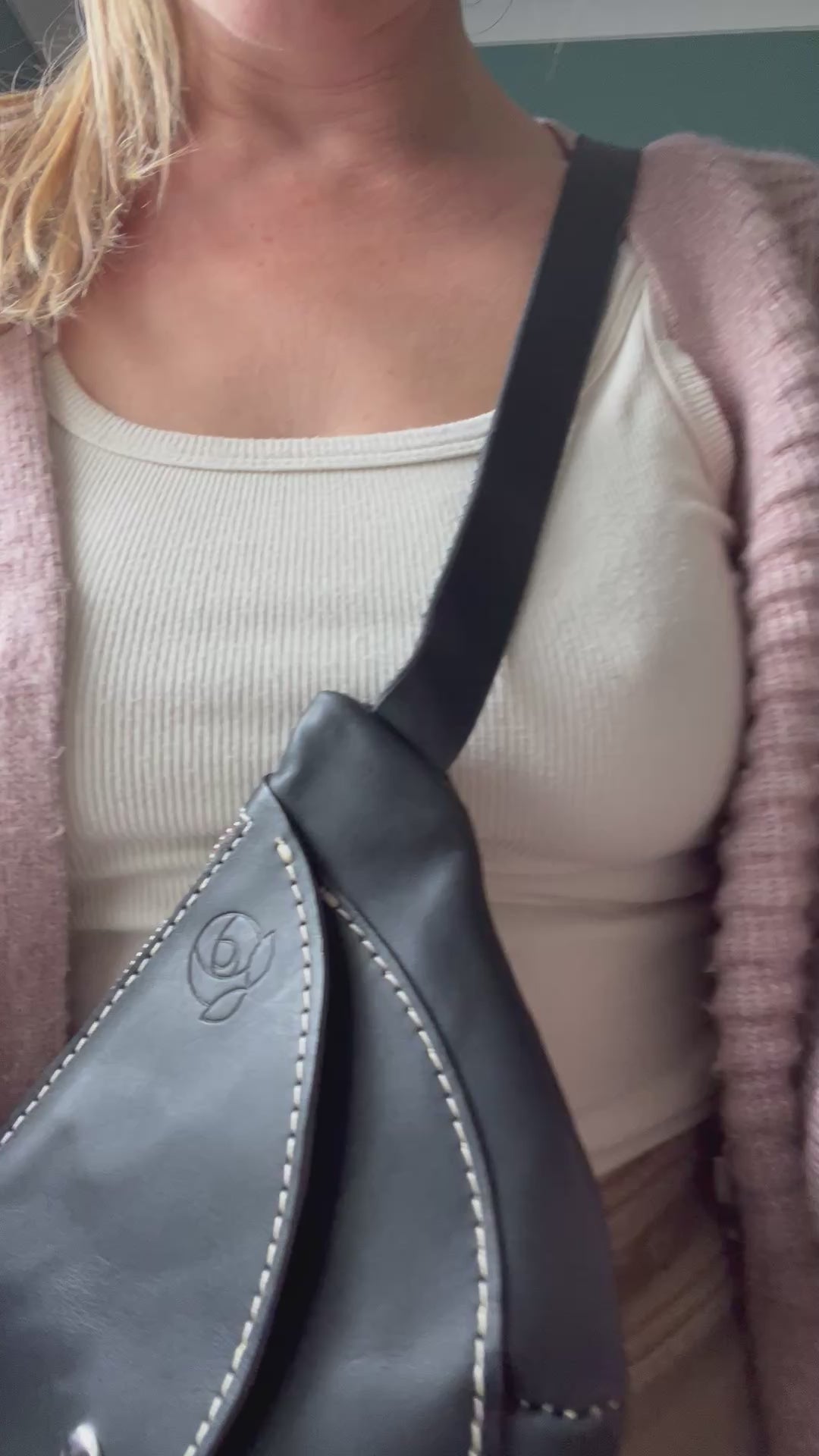 Beautiful black Italian leather sling bag. This bag has an adjustable strap, magnetic snap closure front pocket and zippered main pocket. This bag will fit phone, wallet, keys and other small items all in one hands free and stylish solution.