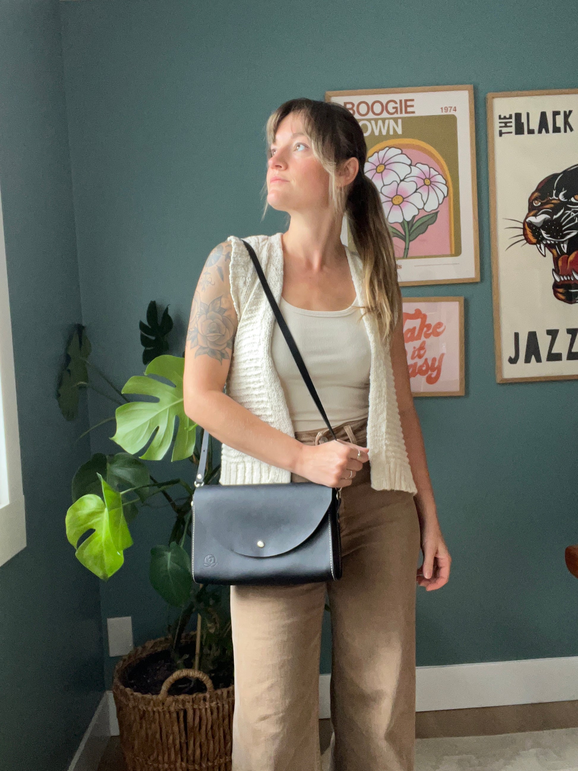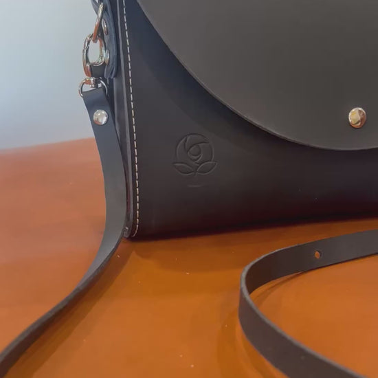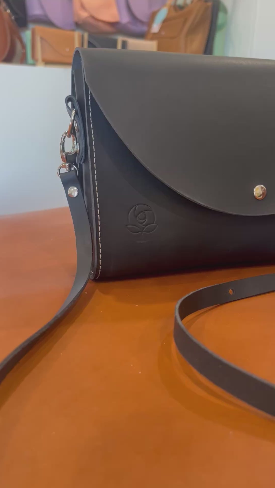 The Westshore Crossbody in Black. This classic leather crossbody bag features a large inside pocket, magnetic snap closure and adjustable strap with articulating hardware.